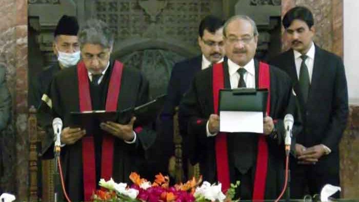 تفصیلات کے مطابق قائم مقام چیف جسٹس لاہور ہائیکورٹ کی حلف برداری تقریب لاہور ہائیکورٹ ججز لاؤنج میں منعقد ہوئی، جسٹس عابد عزیز شیخ نے قائم مقام چیف جسٹس علی باقر نجفی سے ان کے عہدے کا حلف لیا۔