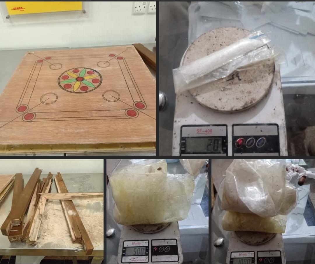 پارسل میں موجود کیرم بورڈ میں مہارت سے چھپائی گئی 1 کلو 20 گرام آئس برآمد کی گئی ۔