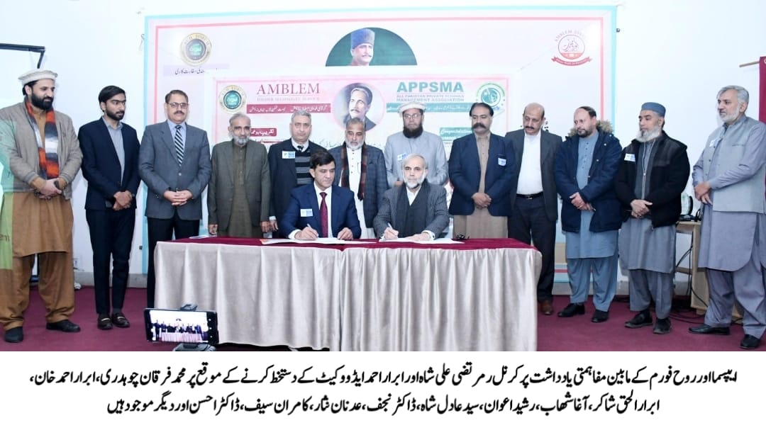 ان خیالات کا اظہار روح فورم کے بانی کرنل ر مرتضی علی شاہ نے آل پاکستان پرائیویٹ سکولز مینجمنٹ ایسوسی ایشن اور روح فورم کے مابین مفاہمتی یاداشت پر دستخط کر نے کے موقع پر کیا۔ نجی تعلیمی ادارہ میں منعقد ہونے والی تقریب میں ایپسما کے مرکزی سینئر نائب صدر محمد فرقان چوہدری ، صدر شمالی پنجاب ابرار احمد خان ، ابرار الحق شاکر ، رشید اعوان ، سید عادل شاہ ، آغا شھاب مقصود ، ممبر بورڈ آف گورنرز فیڈرل تعلیمی بورڈ مسز سکینہ تاج ،عدنان نثار ، کامران سیف قریشی ، ڈاکٹر نجف، ڈاکٹر احسن، حافظ محمد یاسین ، ڈاکٹر اعجاز محمود ، عامر انور، راجہ نعمان قمر اور دیگر نے شرکت کی ۔ کرنل ر مرتضی علی شاہ نے روح فورم کے مقاصد پر روشنی ڈالی اور کہا کہ فکر اقبال کو ساتھ لیکر معاشرے میں اسوہ حسنہ کی خوشبو عام کرنا ہے۔ اللہ تعالیٰ نے انسان کو اپنا نائب بنایا ۔ اس لیےہمیں اپنے منصب اور اسکی ذمہ داریوں کا ادراک کرنا چاہیے ۔ قرآن ہماری شناخت ہے اسکا فہم اور تدبر انتہائی ضروری ہے۔ ایپسما ضلع راولپنڈی کے صدر ابرار احمد ایڈووکیٹ نے کہا کہ ہمیں اپنے اندر یہ شعور بیدار کرنا چاہیے کہ اللہ نے ہمیں کس مقصد کے لیے پیدا کیا ہے۔ علامہ اقبال فرماتے ہیں کہ زندگی کا سارا نچوڑ اللہ کی بندگی کرنا ہے۔ ہم نے خودرو پودے پیدا نہیں کرنے بلکہ ایسی نسل تیار کرنی ہے جو قرآنی فکر کی حامل ہو۔صدر شمالی پنجاب ابرار احمد خان نے کہا کہ ایپسما روح فورم کے مقاصد کے حصول میں ہرقسم کا تعاون کرنے کےلئے تیار ہے۔ روح فورم ایپسما سے وابستہ سکولز کے مستحق بچوں کو تعلیم دینے میں اپنا کردار ادا کرے گی