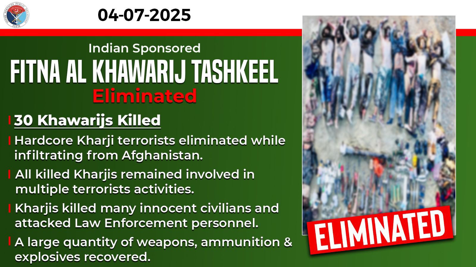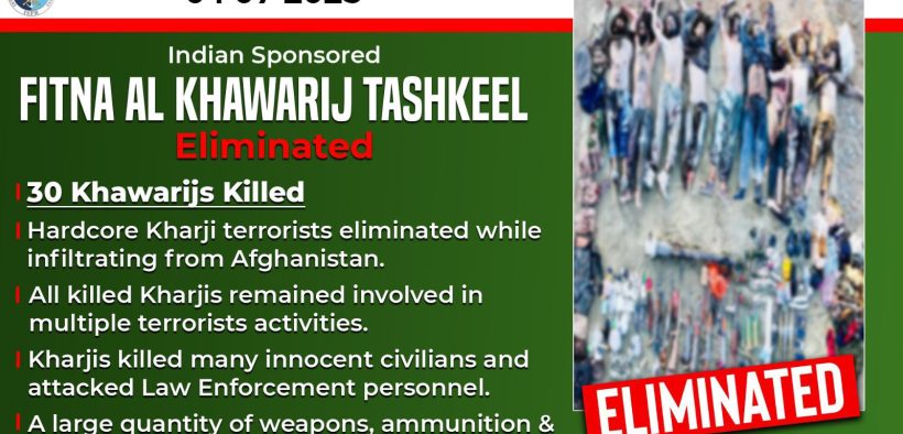 Rawalpindi (Urdu Times) On night 1/2 and 2/3 July 2025, movement of a large group of khwarij, belonging to Indian Proxy Fitna al Khwarij, who were trying to infiltrate through Pakistan-Afghanistan border, was detected by the security forces in general area Hassan Khel, North Waziristan District.