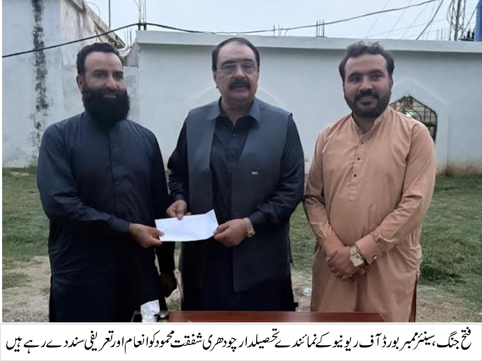 فتح جنگ (اردو ٹائمز) وزیر اعلیٰ پنجاب مریم نواز کی طرف سے فرض شناسی اور اعلی کارکردگی پر تحصیلدارفتح جنگ چودھری شفقت محمود کیلئے تعریفی سند اور کیش انعام سینئر ممبر بورڈ آف ریونیو بابر تارڑ کے خصوصی نمائندے دبنگ اور عوام دوست انتظامی آفیسرتحصیلدار چودھری شفقت محمود کو پنجاب حکومت کی جانب سے نقد انعام اور تعریفی سند دینے کیلئے فتح جنگ تحصیل آفس پہنچ گئے چودھری شفقت محمود کو سند اور کیش انعام دیا چودھری شفقت محمود نے اپنی تعیناتی کے دوران پہلی مرتبہ فتح جنگ میں قبضہ مافیا،لینڈ مافیا،تجاوزات مافیا،ناجائز منافع خوروں کو نکیل ڈالی اپنے دلیرانہ اور مدبرانہ اقدامات کے باعث چودھری شفقت محمود کا شمار ڈویژن سطح پر متحرک افسران میں نمایاں طور پر ہوتا ہے سائل کی ایک کال پر رات کو بھی فوری ایکشن لینے والے آفیسر چودھری شفقت محمود نے محکمہ ریونیو میں عوامی سہولیات کی بروقت فراہمی یقینی بنانے کیلئے اپنے ماتحت عملے کو ہمہ وقت متحرک کر رکھا ہے تحصیل آفس میں ہر سیٹ پر اہلکاروں کی حاضری سو فیصد کرنے کا اعزاز بھی تحصیل دار چوھدری شفقت محمود کو جاتا ہے ان کی خصوصی ہدایت پر تحصیل آفس کے اہلکار سائل کے ساتھ انتہائی خوش اخلاقی سے پیش آتے ہیں تحصیل آفس میں شام گئے تک چودھری شفقت محمود اپنی ٹیم کے ہمراہ عوامی خدمت میں لگے رہتے ہیں سائلین کے ریونیو مسائل کے فوری حل کیلئے ہنگامی اقدامات کیے گئے تقسیم،نشاندہی اور دیگر زمین جائیداد کے تنازعات اور مقدمات کو فوری نمٹایا جا رہا ہے اس حوالہ سے عدالتی مقدمات میں ریکارڈ فیصلے کیے گئے۔سینئر ممبر بورڈ آف ریونیو کی طرف سے ڈپٹی کمشنر،ایڈیشنل ڈپٹی کمشنر ریونیو کو بھی تعریفی اسناد اور نقد انعام دیے گئے،اہل علاقہ کا فتح جنگ کا نام پورے صوبہ میں روشن کرنے پر تحصیلدار فتح جنگ چودھری شفقت محمو د کو زبر دست انداز میں خراج تحسین پیش کیا،علاوہ ازیں فتح جنگ تحصیل کے پٹواری شجاع اور آکاش پٹواری کیلئے بھی انعام بھجوائے گئے۔