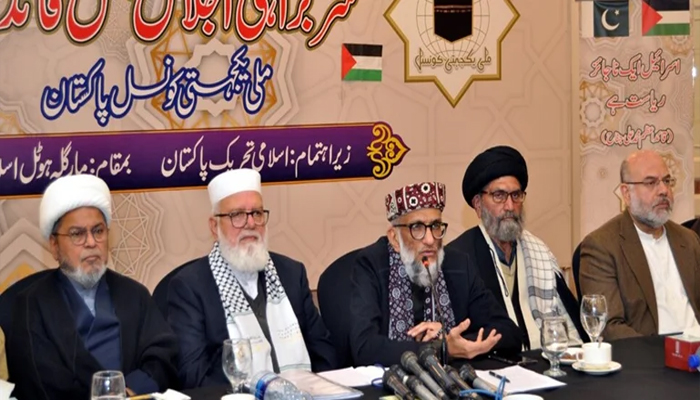 تفصیلات کے مطابق ملی یکجہتی کونسل کا اجلاس اسلام آباد میں ہوا۔ اجلاس کے بعد جاری اعلامیہ میں ایران اور فلسطین پر اسرائیلی حملوں کی مذمت کرتے ہوئے ایران کے جواب کو جائز قرار دیا گیا اور واضح کیا کہ فلسطین کے دو ریاستی حل کو تسلیم نہیں کریں گے۔ اگر حکومت نے اسرائیل کو تسلیم کرنے کی کوشش کی تو سخت مزاحمت کی جائے گی۔