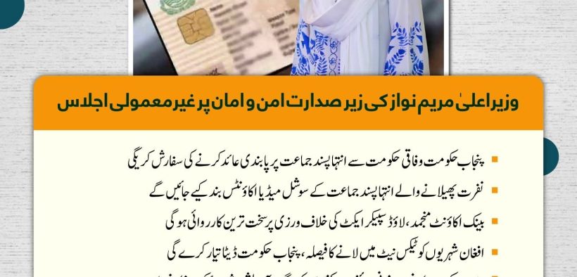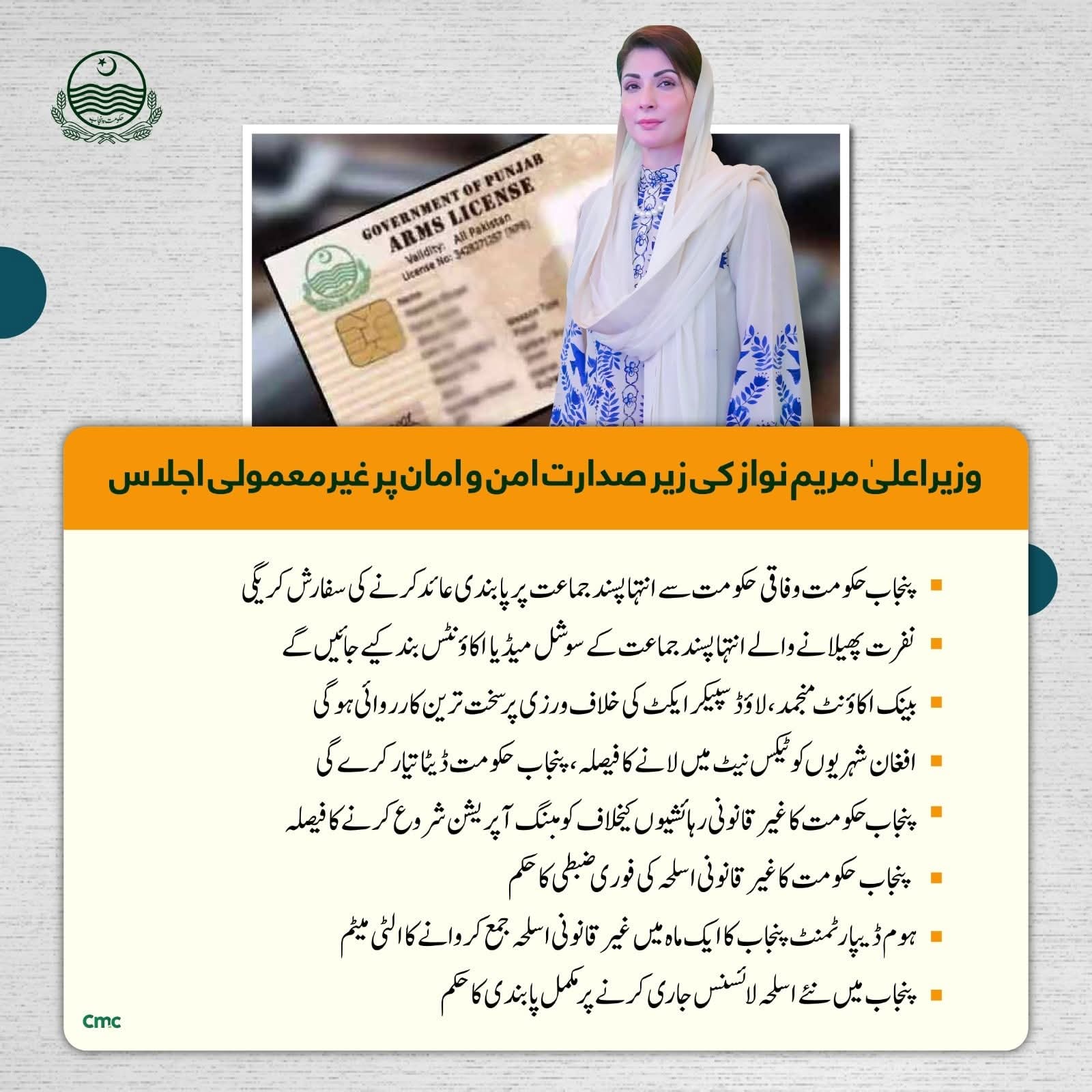 راولپنڈی (اردو ٹائمز) وزیر اعلیٰ مریم نواز کی زیر صدارت اجلاس میں انتہا پسند جماعت پر پابندی کی سفارش، نفرت انگیز سوشل میڈیا اکاؤنٹس کی بندش، غیر قانونی اسلحہ ضبط کرنے اور نئے لائسنس پر پابندی کا فیصلہ کیا گیا۔ افغان شہریوں کو ٹیکس نیٹ میں لانے اور غیر قانونی رہائشیوں کیخلاف کومبنگ آپریشن کا بھی اعلان کیا گیا۔