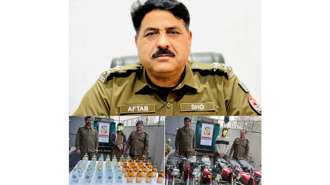 راولپنڈی (اردو ٹائمز)(مظہر شاہ)ایس ایچ او تھانہ صدرواہ آفتاب شاہ کی سربراهی میں پولیس ٹیم کی کارروائی، شراب سپلائر سمیت موٹر سائیکل چوری کی وارداتوں میں ملوث شخص گرفتار ، 60 بوتل شراب جبکہ 06 مسروقہ موٹر سائیکل برآمد تفصیلات کے مطابق ایس ایچ او صدرواہ سید آفتاب شاہ کی سربراهی میں پولیس ٹیم نے الگ الگ کارروائیاں کرتے ہوئے موٹرسائیکل چوری کی وارداتوں میں ملوث شخص کو گرفتارکرلیا، زیرحراست شخص سے پولیس ٹیم نے 06 مسروقہ موٹر سائیکل برآمد کر لئے جبکہ دوسری کاروائی میں پولیس ٹیم نے ایک شراب سپلائر کو رنگے ہاتھوں گرفتار کر کے 60 بوتل شراب برآمد کر لی ، ایس پی پوٹھوہار طلحہ ولی نے ایس ایچ او تھانہ صدرواہ اور پولیس ٹیم کو شاباش دیتے ہوئے کہا کہ زیر حراست افراد کو ٹھوس شواہد کے ساتھ چالان عدالت کیا جائے گا، شہریوں کے جان و مال پر حملہ کرنے والے قانون کی گرفت سے نہیں بچ سکتے۔