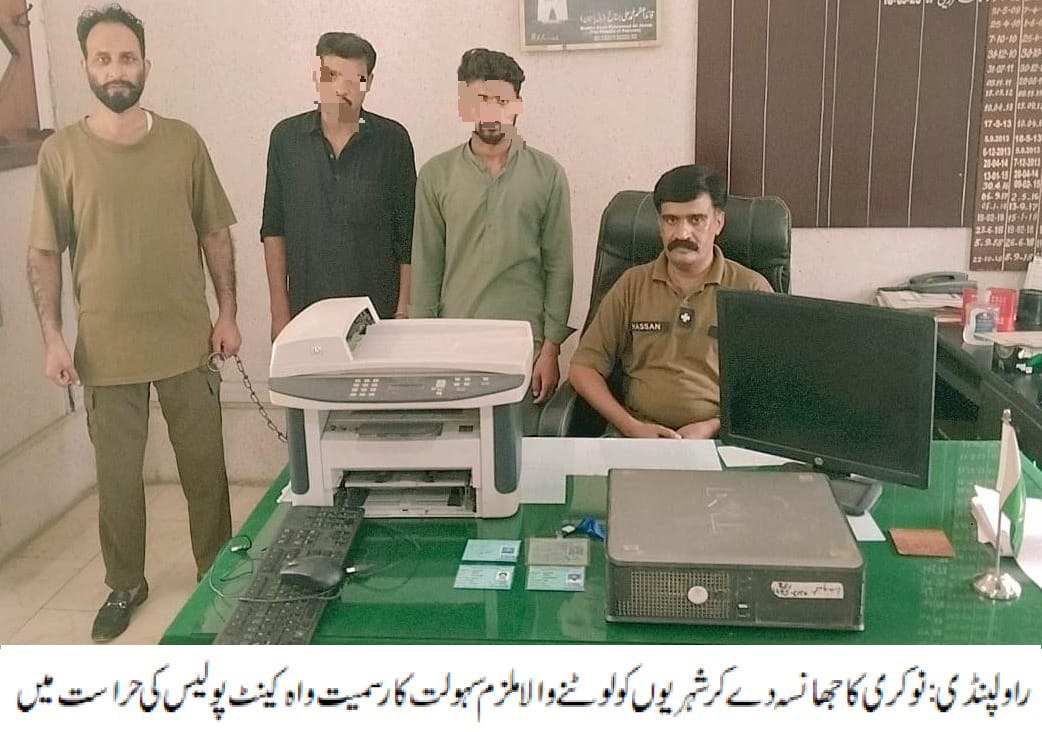 ،نوکری کا جھانسہ دے کر شہریوں کو لوٹنے والا ملزم سہولت کار سمیت گرفتار، کمپیوٹر، پرنٹر،ایل ای ڈی اورجعلی کارڈ ز برآمد۔تفصیلات کے مطابق واہ کینٹ پولیس نے کاروائی کرتے ہوئے نوکری کا جھانسہ دے کر شہریوں کو لوٹنے والے ملزم جواد عرف طوطی کو سہولت کارعبداللہ سمیت گرفتار کرلیا، ملزمان سے کمپیوٹر، پرنٹر،ایل ای ڈی اورجعلی کارڈ ز برآمد ہوئے،ایس ایچ اونے بتایاکہ ملزم جواد عرف طوطی شہریوں کو نوکری کا جھانسہ دے کر رقم لیتا اور انھیں جعلی کارڈ بنا کر دیتاتھا، ایس پی پوٹھوہار محمد وقاص خان نے واہ کینٹ پولیس کو شاباش دیتے ہوئے کہا کہ ملزمان کو ٹھوس شواہد کے ساتھ چالان عدالت کرکے قرار واقعی سزا دلوائی جائے گی،جعلی سازی کے ذریعے شہریوں کو لوٹنے والے ملزمان قانون کی گرفت سے نہیں بچ سکتے۔