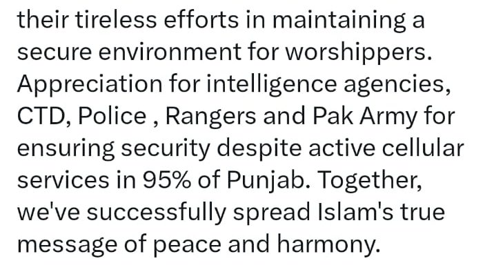 پنجاب بھر میں 95 فیصد علاقوں میں موبائل فون سروس بحال ہونے کے باوجود سیکورٹی کو یقینی بنانے پر انٹیلیجنس ایجنسیوں، سی ٹی ڈی، پولیس، رینجرز اور پاک فوج کی کاوشوں کو سراہتا ہوں