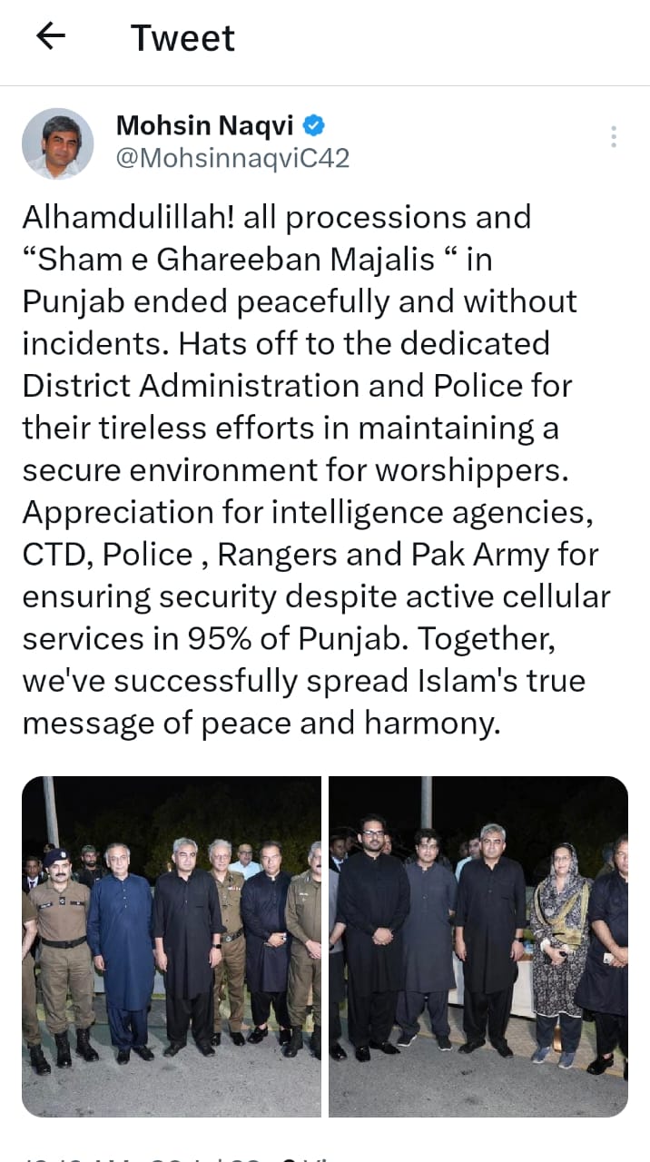 الحمدللہ! پنجاب بھر میں تمام جلوس اور شام غریباں کی مجالس پرامن طور پر اختتام پذیر ہوئیں اور